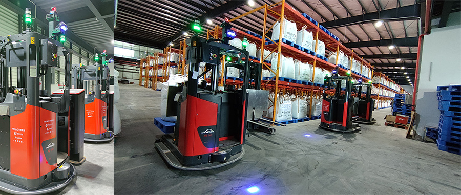 叉车式AGV:用于堆栈托盘类货物的物流周转,由液压升降系统、差速驱动系统、PLC控制系统、导引系统、通信系统、警示系统、操作系统和动力电源组成,是集液压升降和PLC控制的可编程无线调度的自动导引小车。