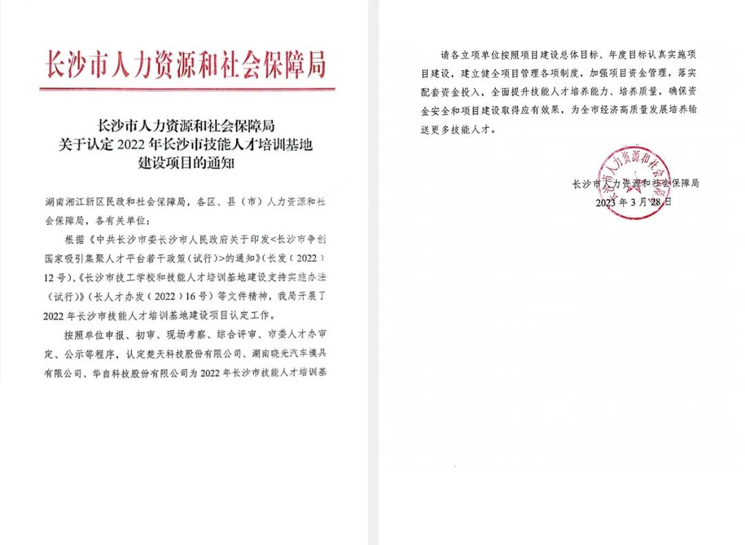 近日,长沙市人力资源和社会保障局印发《关于认定2022年长沙市技能人才培训基地建设项目的通知》,华体会(中国)作为首批认定企业,获长沙市技能人才培训基地建设项目立项单位。本项目是长沙市争创国家吸引集聚人才平台若干政策之一,首批评选企业不超过3家。