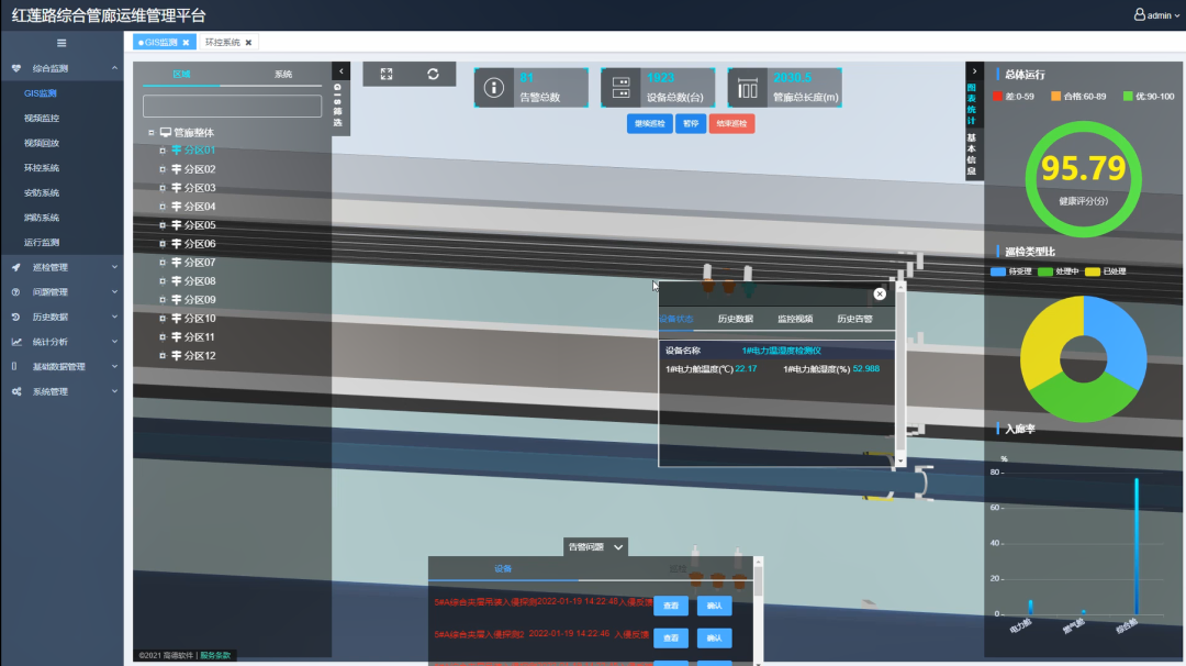 集成度高:集成环控系统、安防系统、消防系统、通信子系统,几乎涵盖管廊中所有子系统,一平台管控所有设备;