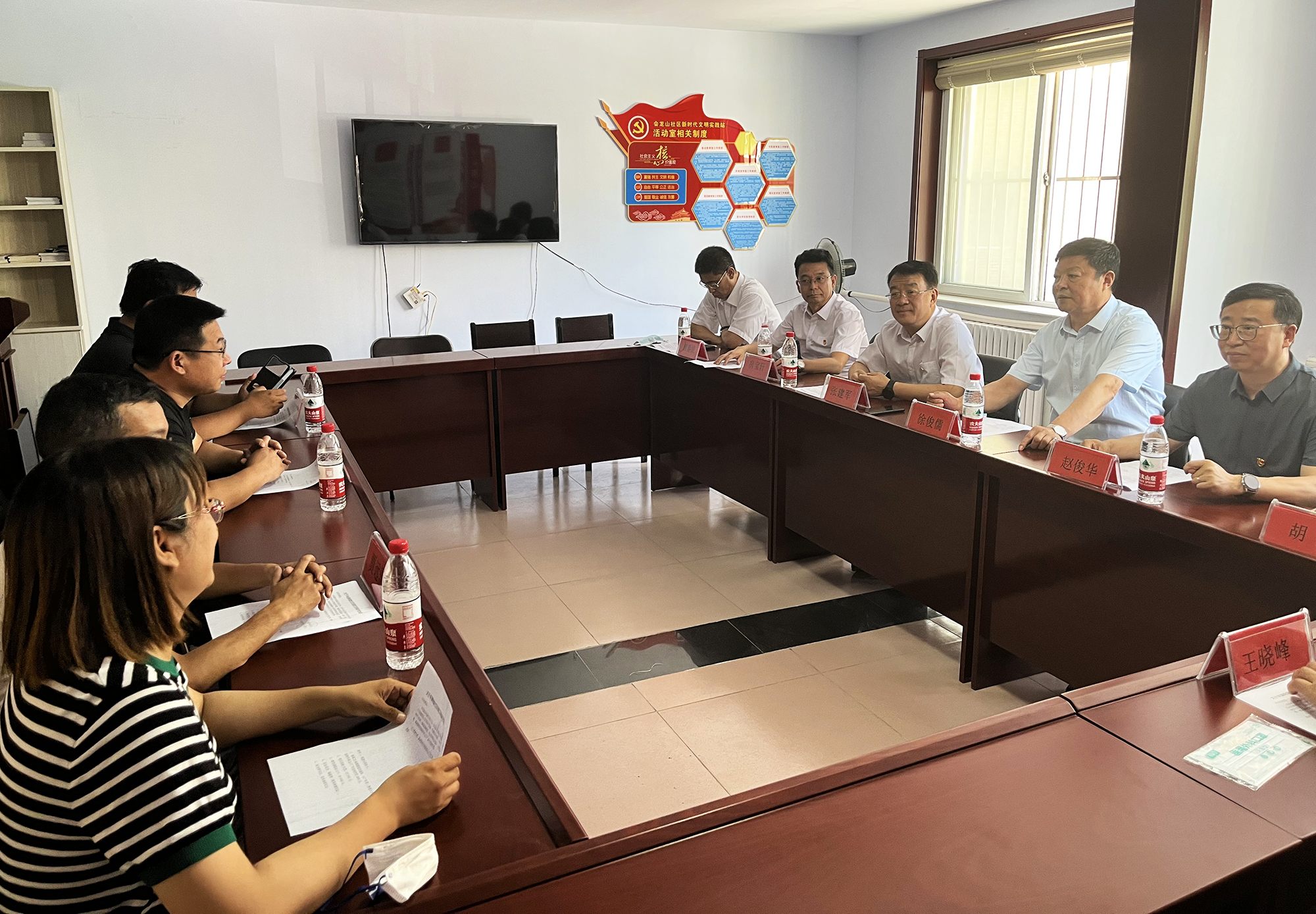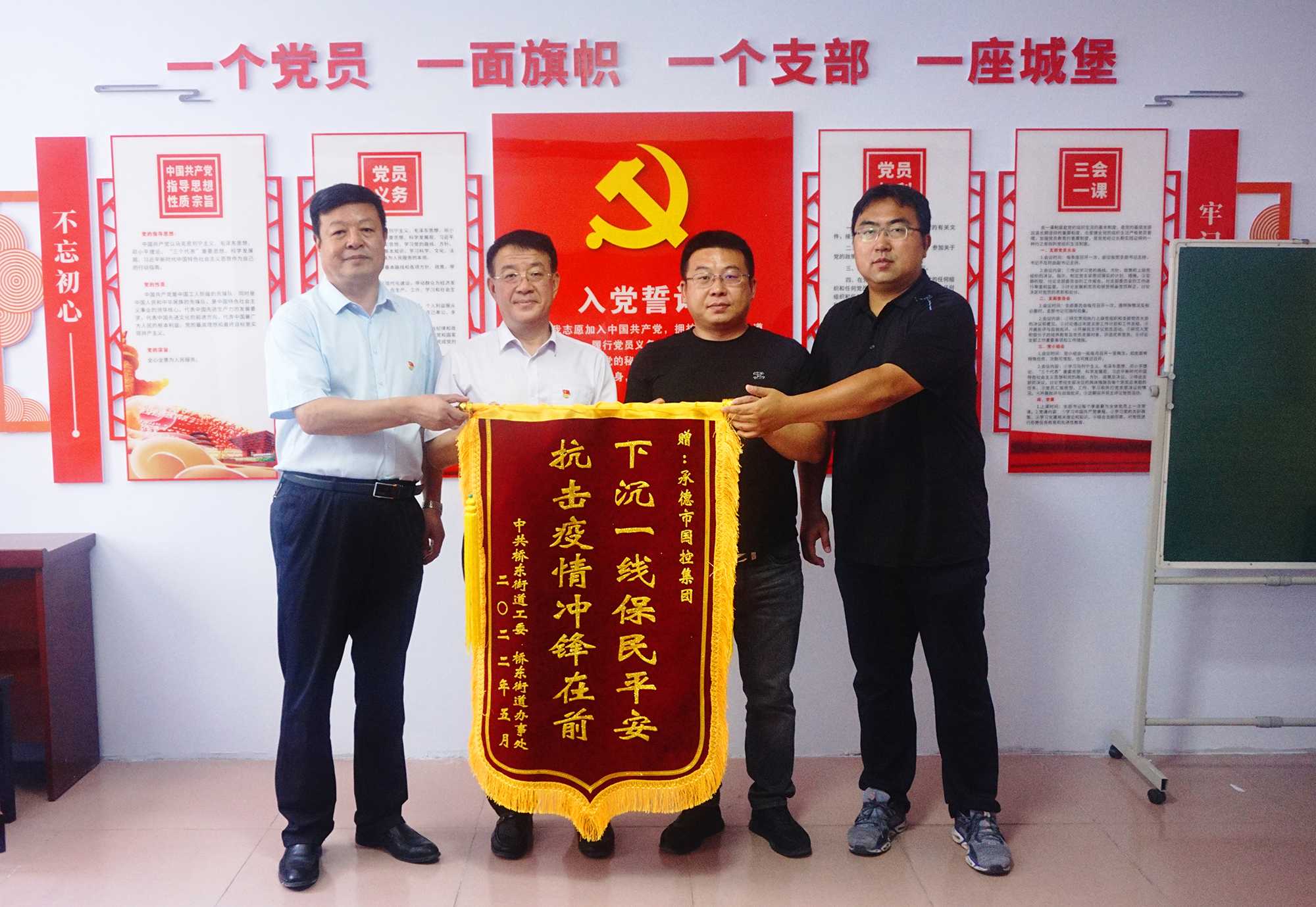 捐赠仪式后,球友会领导班子与桥东街道、会龙山社区主要负责人,就结对帮建工作进行座谈,详细了解了创城工作开展情况、存在问题及下一步打算,针对社区基础设施不完善、公共停车泊位施划不合理、楼道杂乱和小广告乱贴等问题,研究制定了具体举措。会上,为感谢球友会在抗击疫情和结对帮建工作中的大力支持,桥东街道、会龙山社区向集团公司赠送了“下沉一线保民平安、抗击疫情冲锋在前”锦旗。