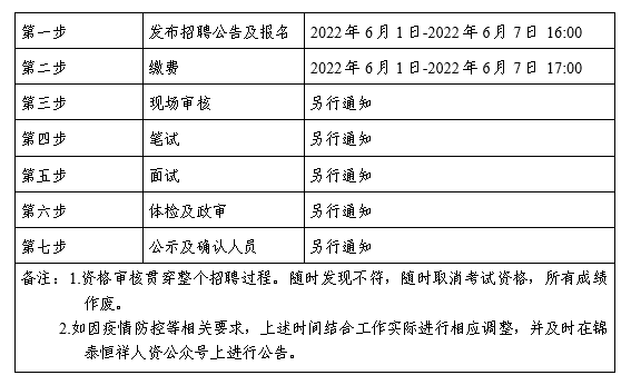 2022年6月1日至2022年6月7日16:00 在锦泰恒祥人资官网(www.jthxhr.com)、“锦泰恒祥人力资源服务有限公司”微信公众号、“球友会”官方网站(www.cvinternationalsteel.com)及上级部门要求的相关网站等发布招聘公告。