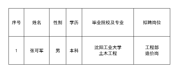 因公司发展需要,承德市国越房地产开发有限公司委托第三方机构面向社会公开工程部造价岗员工1名。现对拟录用人员信息进行公示,公示期间如有异议,可通过电话、信函等方式反映,反映意见请署真实姓名。