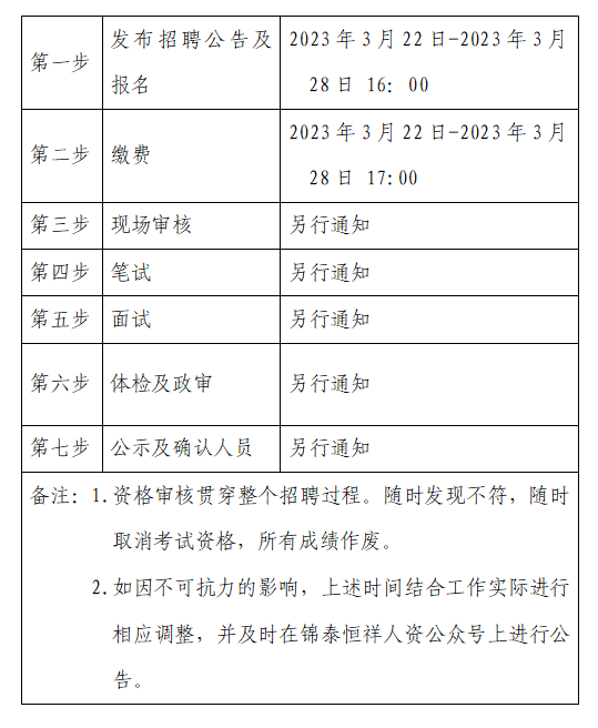 2023年3月22日-2023年3月28日 16:00在锦泰恒祥人资官网(www.jthxhr.com)、“锦泰恒祥人资”微信公众号、“球友会”官方网站(www.cvinternationalsteel.com)及上级部门要求的相关网站等发布招聘公告。