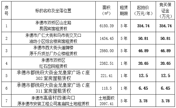 我集团全资子公司承德市国控资产运营有限公司、承德市国瑞物业管理有限公司委托河北福成拍卖有限公司,定于2020年1月21日上午9时在承德市双桥区武烈路6号紫御国际假日酒店会议室公开拍卖下列标的,现将有关事项公告如下: