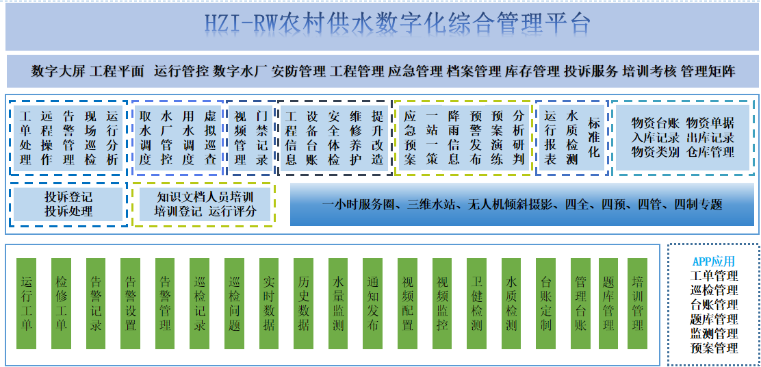 Ø 县域管理-农村供水数字化综合管理平台包含供水调度一张图、水厂/水站运行管控、工程平面地图、农饮水APP等功能模块。实现取水、制水、输水、配水等各环节功能,形成农村供水服务闭环