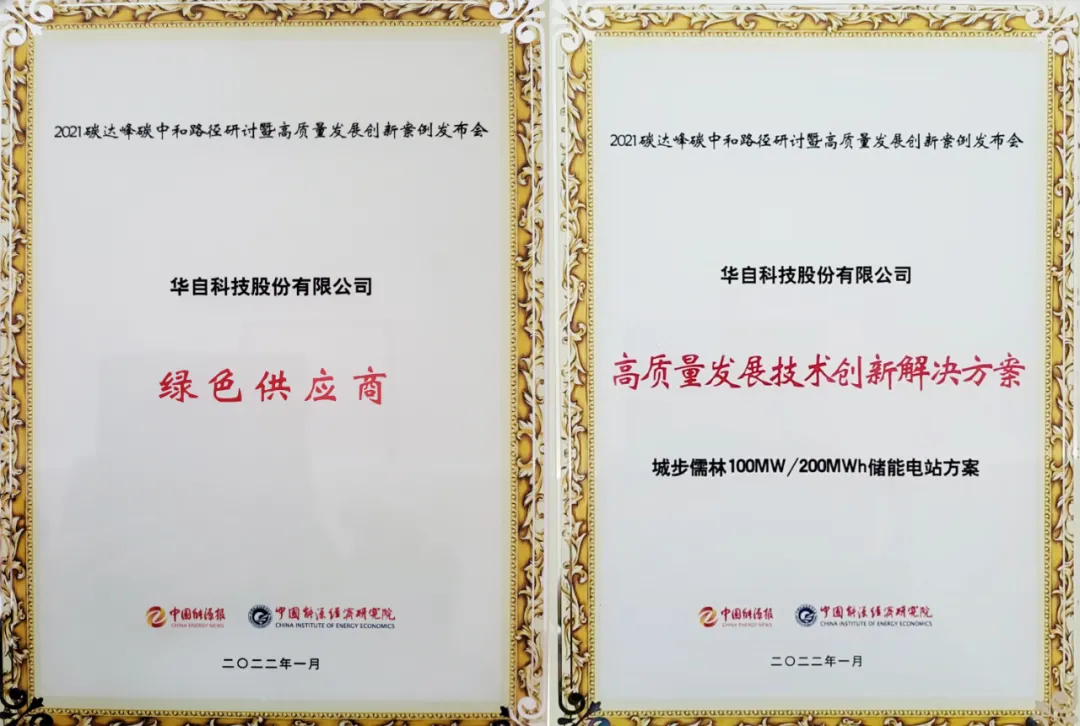 近日,由中国能源报主办,中国能源经济研究院学术支持的“2021碳达峰碳中和路径研讨暨高质量发展创新案例发布会”在北京举行。发布会上,华体会(中国)以“城步儒林100MW/200MWh储能电站方案”获得“高质量发展技术创新解决方案”和“绿色供应商”两项荣誉。