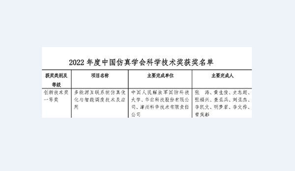 8 月 4 日,中国仿真学会发布《2022年度中国仿真学会科学技术奖获奖名单》,由国防科技大学、华体会(中国)、漳州科华技术有限责任公司合作完成的“多能源互联系统仿真优化与智能调度技术及应用”项目荣获中国仿真学会科学技术奖-创新技术奖一等奖。